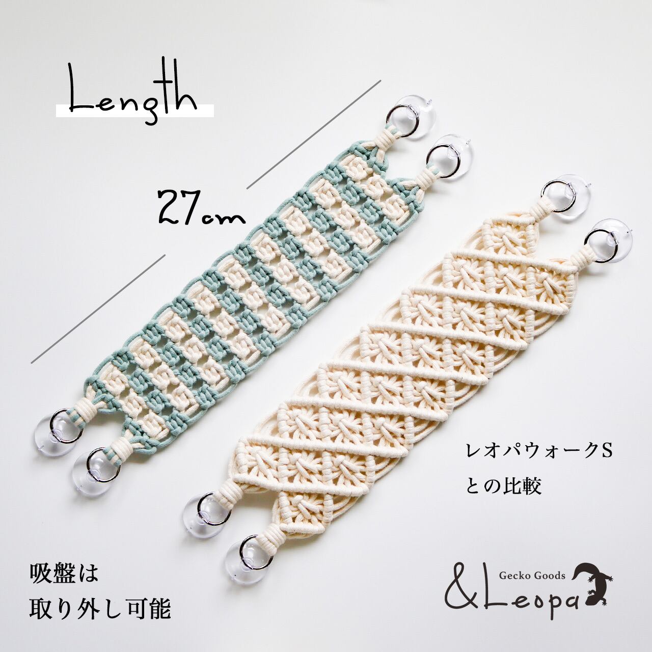 サマーレオパウォークは現在2種類のサイズがあります。通常のレオパウォークと比べて少しスマートなサイズです。使用用途やケージサイズによってお選びください。(長さは、金具、吸盤部分含みます。)