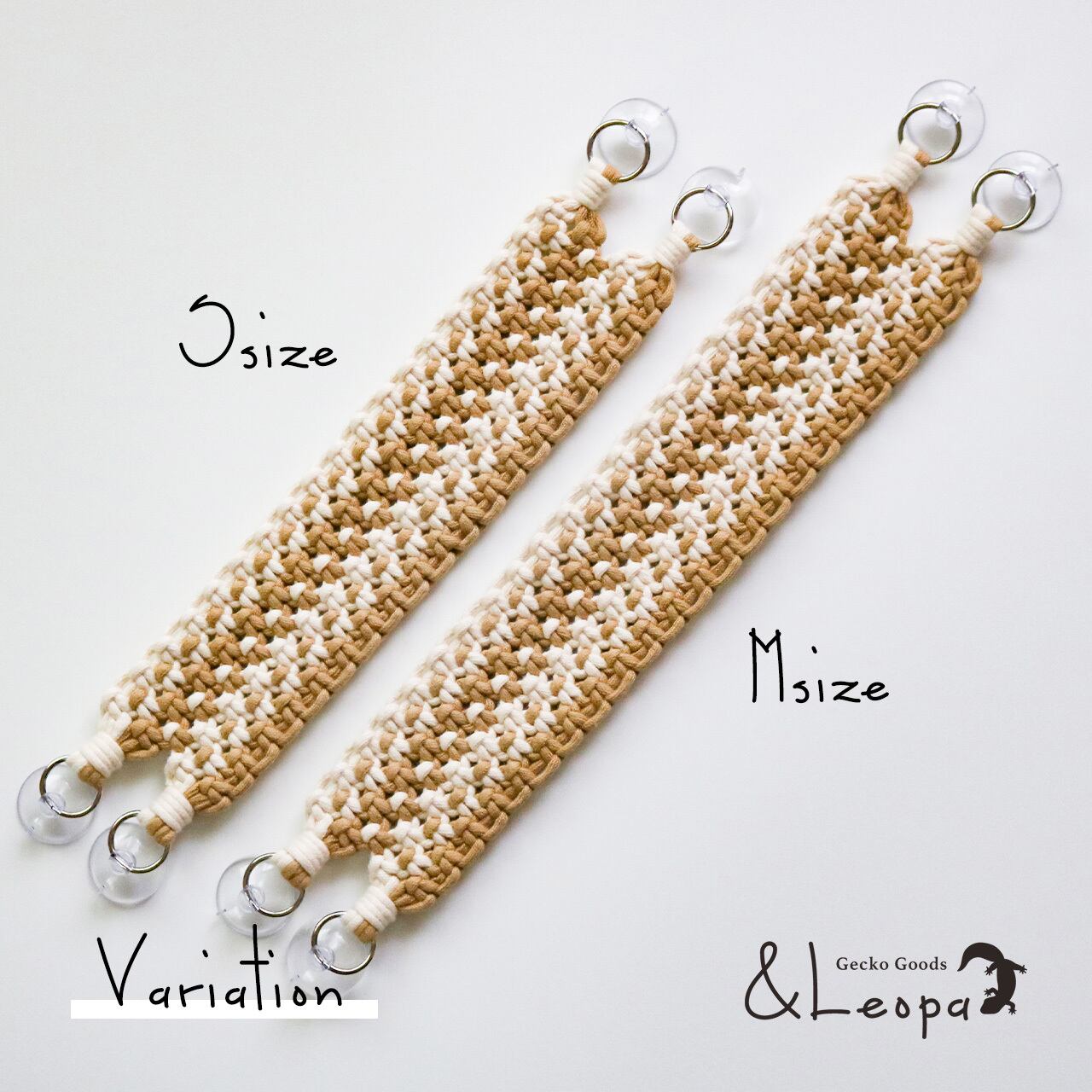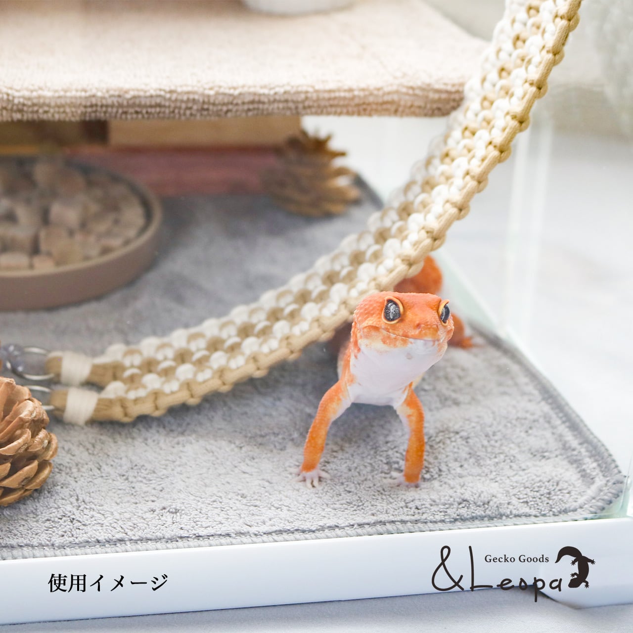 また、引っかかって怪我をしないよう、ほつれにくいマクラメ糸を使用していますので、活動的なレオパにも安心してご使用いただけます。