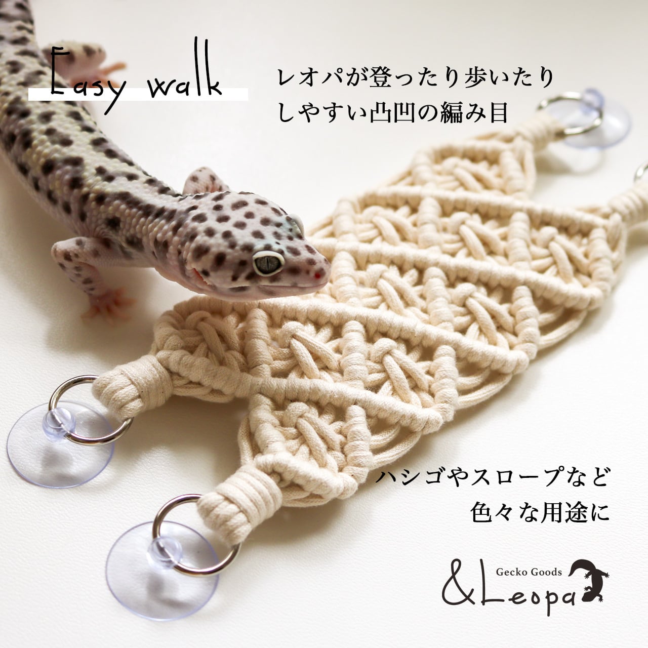 また、引っかかって怪我をしないよう、ほつれにくいマクラメ糸を使用していますので、活動的なレオパにも安心してご使用いただけます。