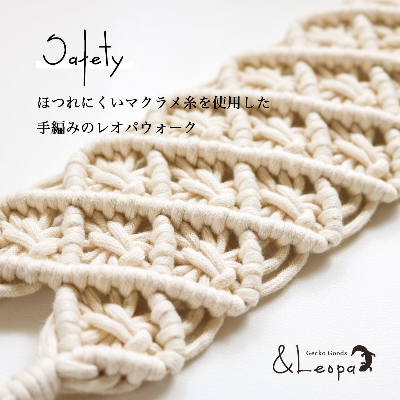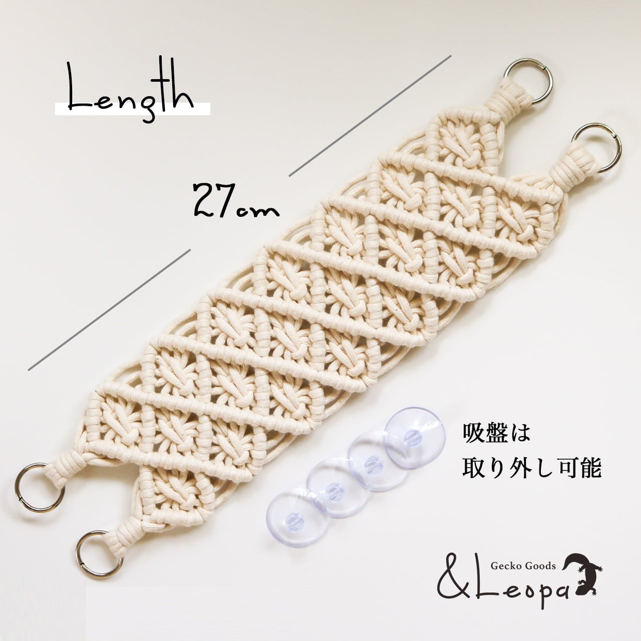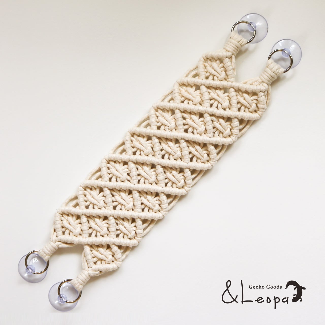 また、引っかかって怪我をしないよう、ほつれにくいマクラメ糸を使用していますので、活動的なレオパにも安心してご使用いただけます。