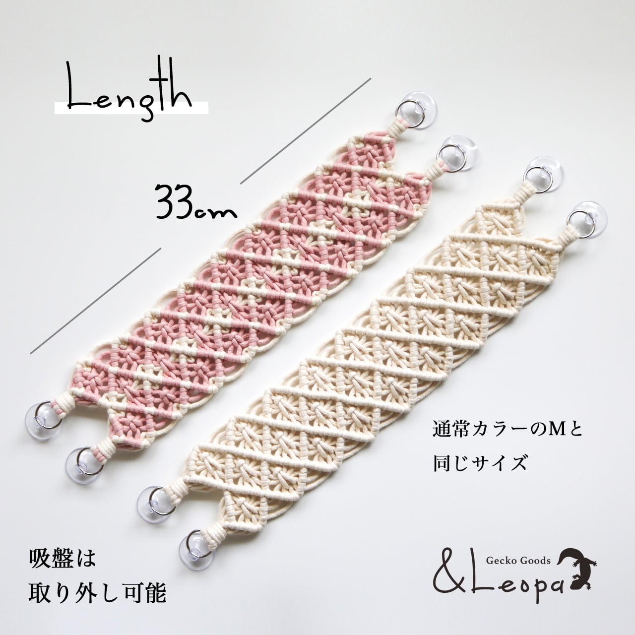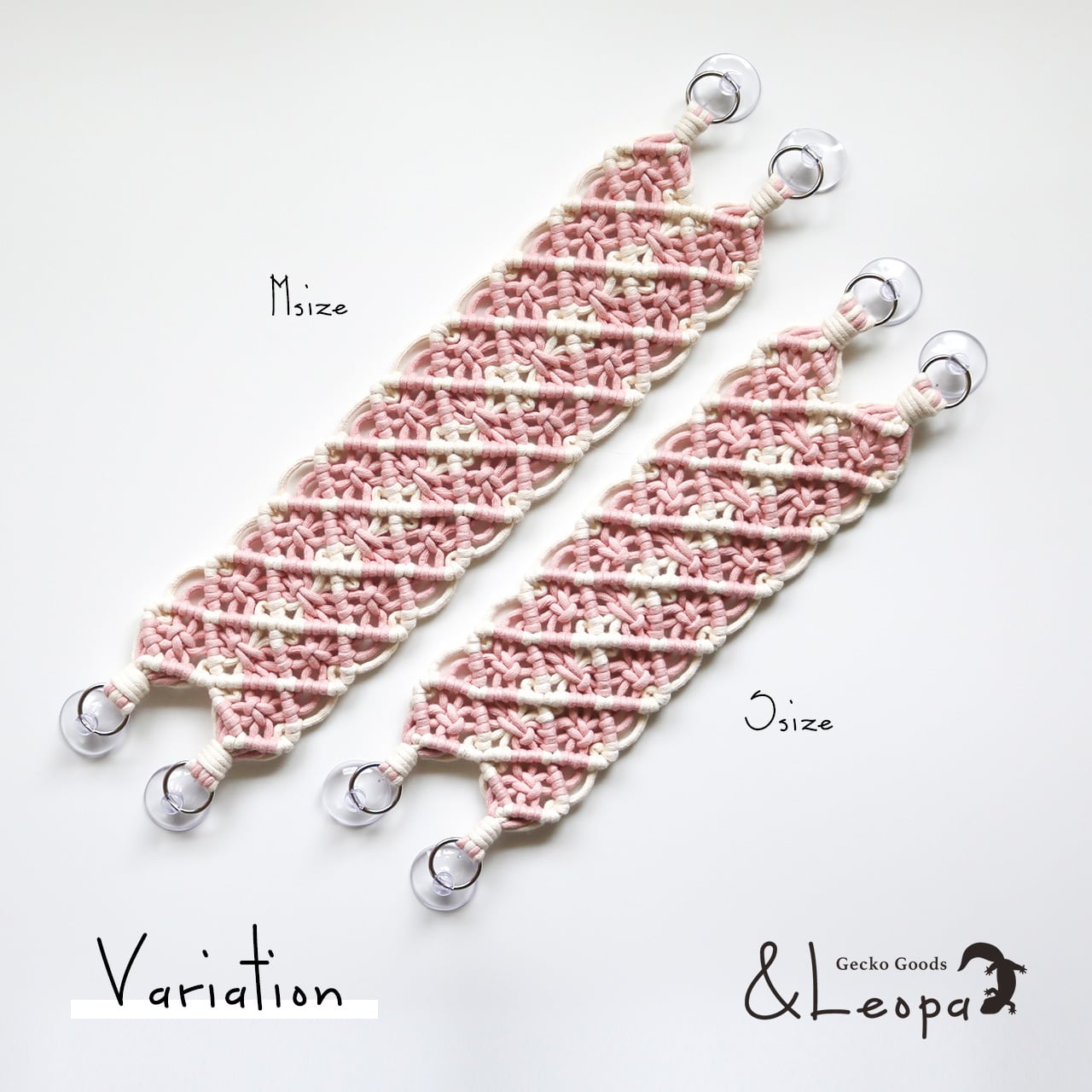 また、引っかかって怪我をしないよう、ほつれにくいマクラメ糸を使用していますので、活動的なレオパにも安心してご使用いただけます。
