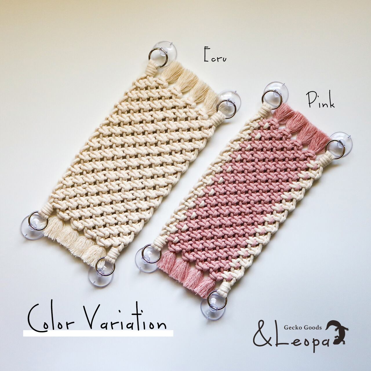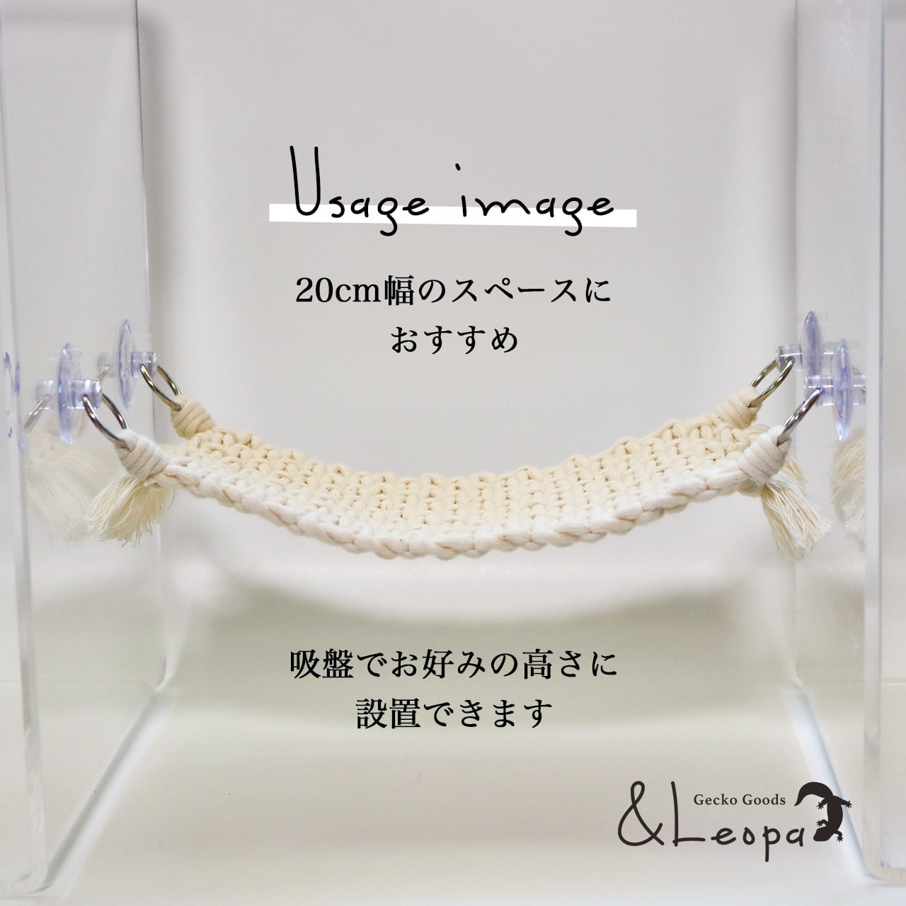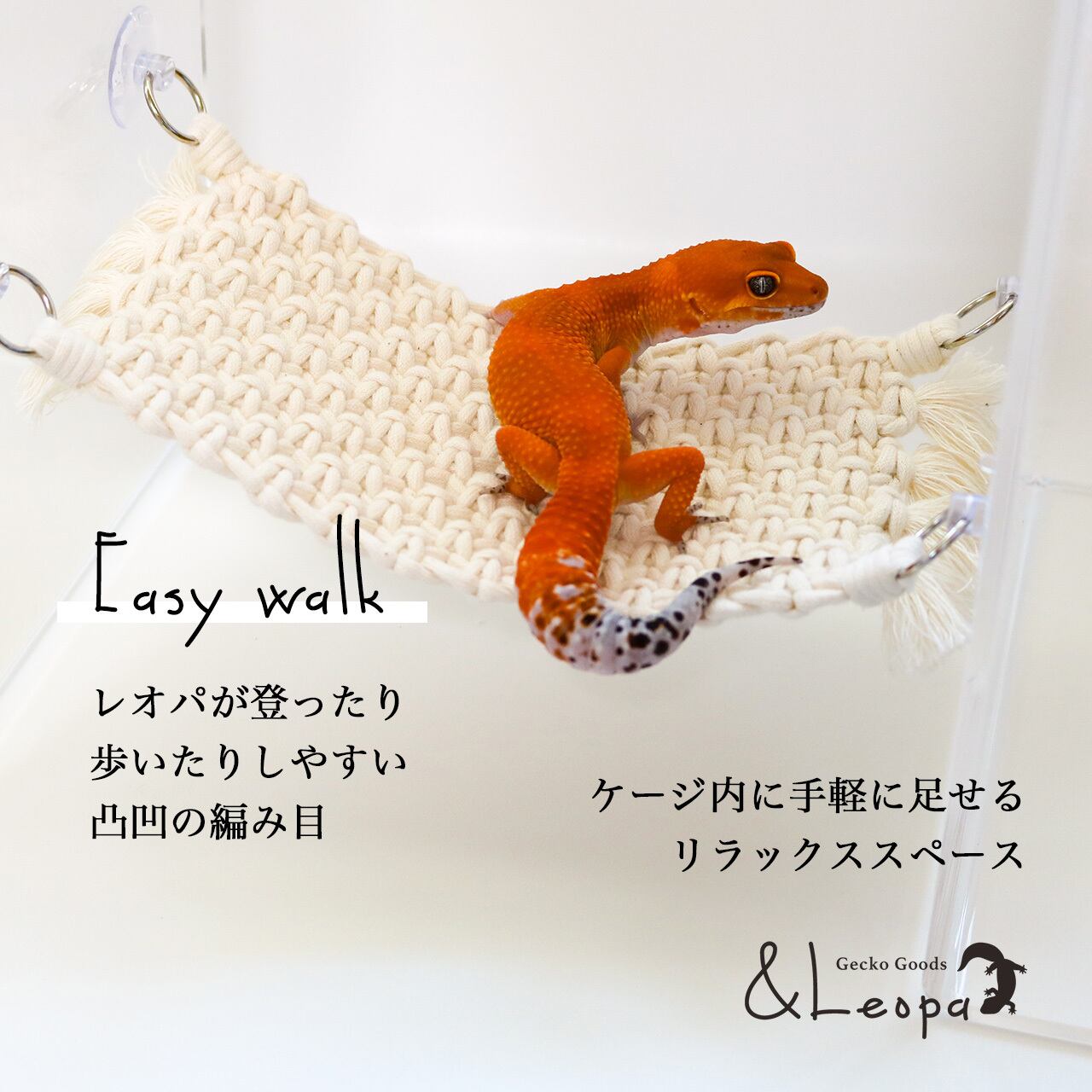 引っかかって怪我をしないよう、ほつれにくいマクラメ糸を使用していますので、活動的なレオパにも安心してご使用いただけます。